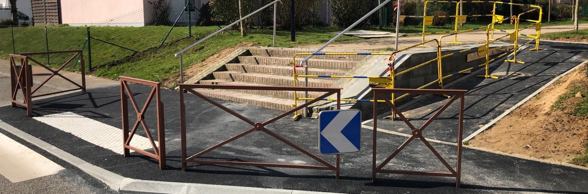 A cette intersection, une rampe a été créée pour faciliter le passage vers la place de Caux (en poussette par exemple) et une zone de ralentissement sur la rue Victor Hugo a été aménagée pour sécuriser l'intersection avec le Mail (travaux réalisés en mars 2021 par la CULHSM)